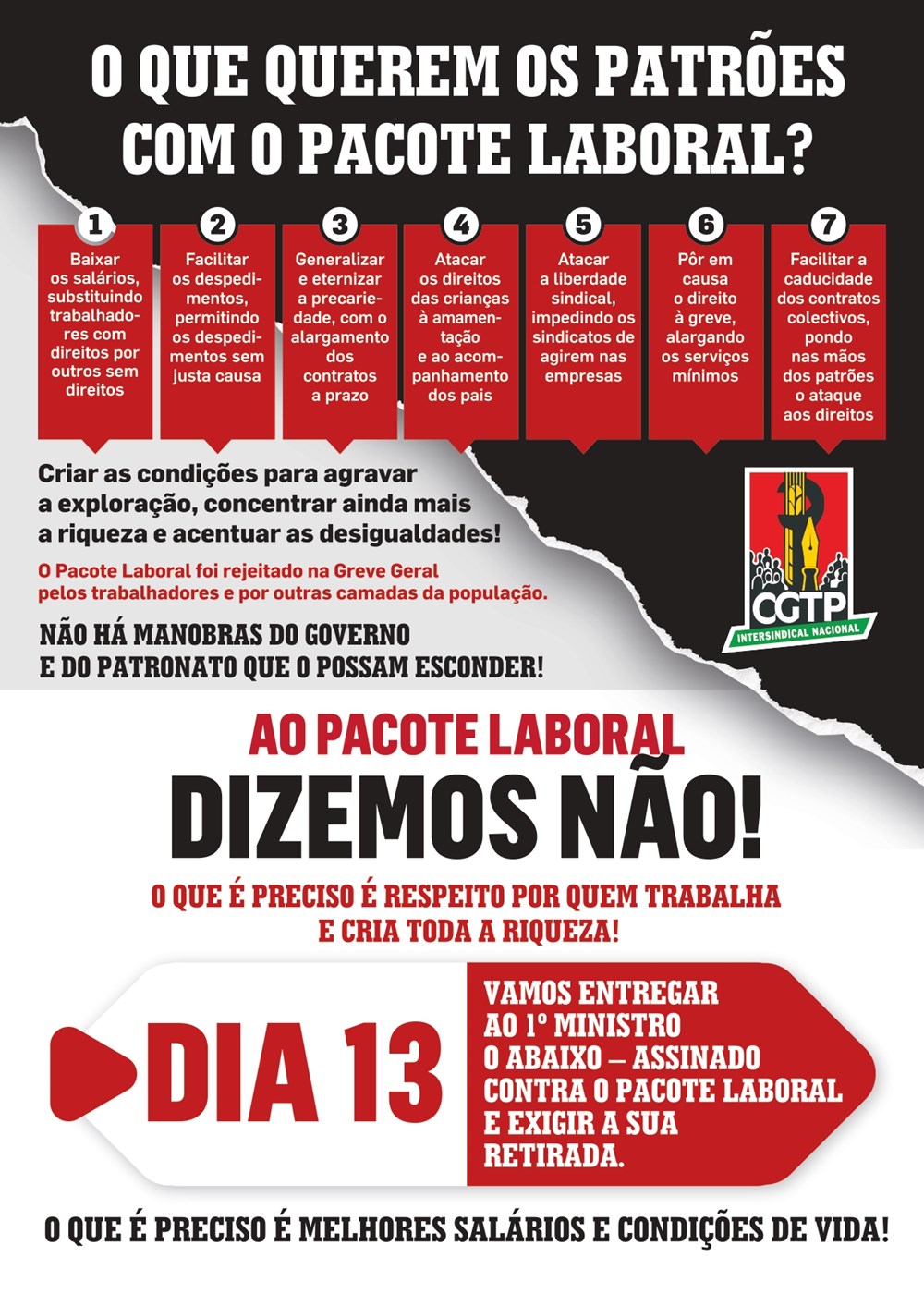 Depois da grande Greve Geral do passado dia 11 de dezembro, onde os trabalhadores se fizeram ouvir e afirmaram bem alto a sua rejeição ao pacote laboral e a exigência da sua retirada, a CGTP-IN decidiu marcar para o próximo dia 13 de Janeiro de 2026 uma Manifestação, com início pelas 14h30 no Camões seguindo para S. Bento.