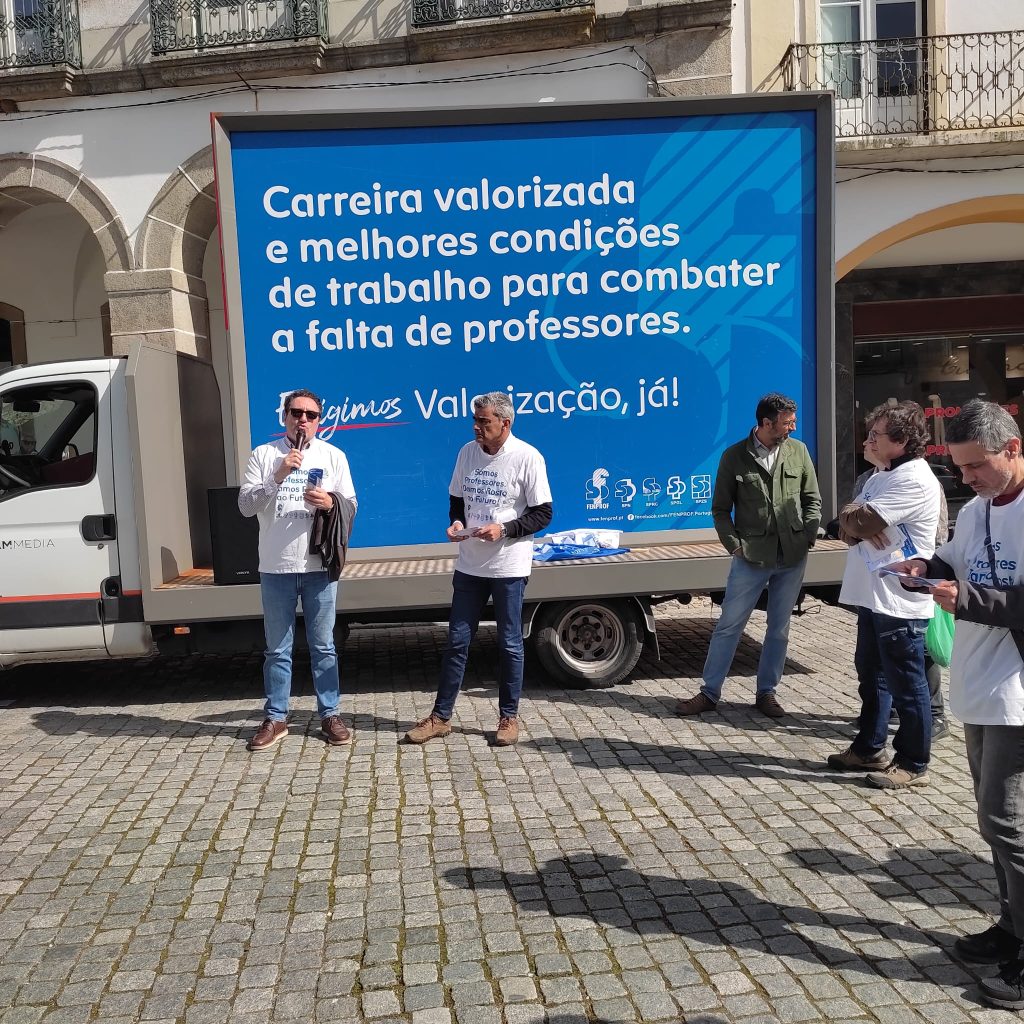 Na Praça do Giraldo, a caravana incluiu ainda momentos de contacto com a população e declarações à comunicação social, dando expressão pública às reivindicações dos docentes.