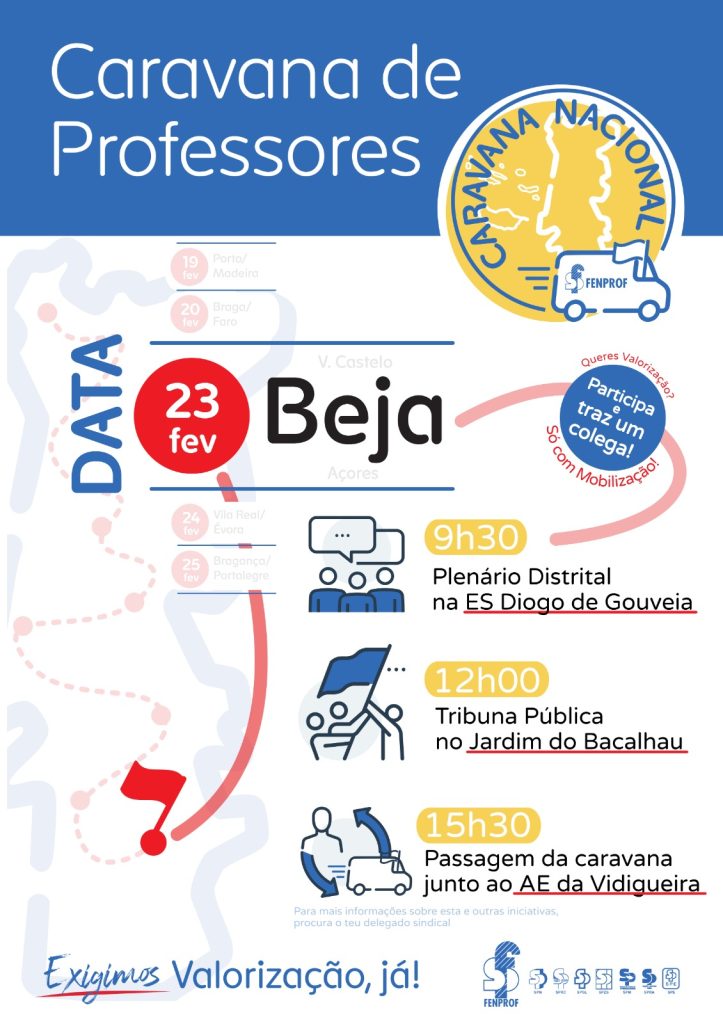 Depois do arranque no dia 19 com o envolvimento de muitos docentes, escolas e população, a FENPROF prosseguiu com a Caravana Nacional “Somos Professores. Damos rosto ao futuro! Exigimos valorização, já!” nos distritos de Braga e Faro. Na segunda-feira, dia 23, o SPZS irá continuar esta iniciativa em BEJA, realizando um plenário às 9h30 na Escola Secundária Diogo de Gouveia, seguido de Tribuna Pública no Jardim do Bacalhau, às 12 horas. Durante a tarde, a Caravana estará no Agrupamento de Escolas da Vidigueira de onde seguirá para o distrito de Évora no dia 24.