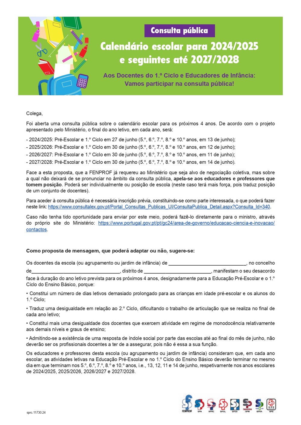 - Admitindo-se a existência de uma resposta de índole social por parte das escolas até ao final do mês de junho, não deverão ser os profissionais docentes a ter de a assegurar, pois não é essa a sua função. Os educadores e professores desta escola (ou agrupamento ou jardim de infância) consideram que, em cada ano escolar, as atividades letivas na Educação Pré-Escolar e no 1.º Ciclo do Ensino Básico deverão terminar no mesmo dia em que terminam nos 5.º, 6.º, 7.º, 8.º e 10.º anos, i.e., 13, 12, 11 e 14 de junho, respetivamente nos anos escolares de 2024/2025, 2025/2026, 2026/2027 e 2027/2028.
