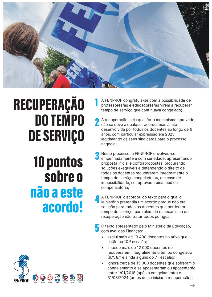 A FENPROF não desiste de melhorar o mecanismo de recuperação que lhe foi apresentado e estará na primeira linha do esclarecimento, do apoio, da ação para melhorar o mecanismo de recuperação, da luta por um tratamento igual para todos os professores/as e educadores/as.